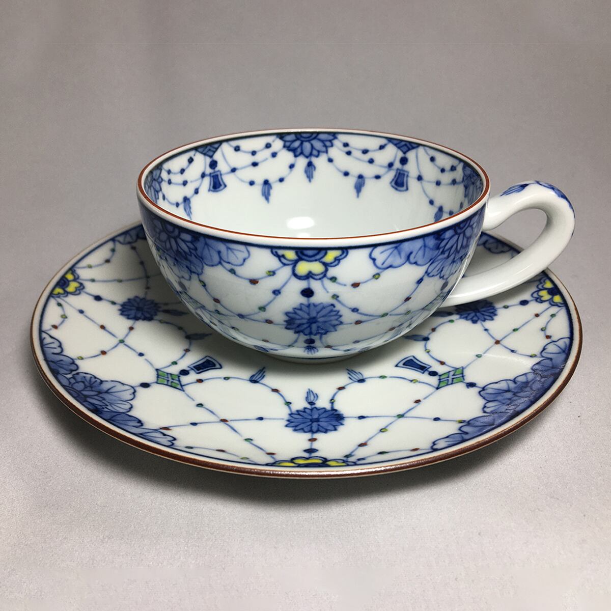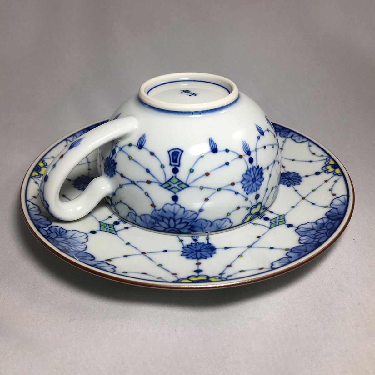 京都・清水焼窯元・竹峰窯のオリジナル作品です。生地も絵も全て熟練した職人の手作りで清水焼特有の薄手で軽い仕上がりになっています。瓔洛とは神社仏閣の装飾品からデザインしたものです。ネックレスの様な図柄に色とりどりの上絵付を施し、繊細で美しいカップを作りました。 サイズ:カップ径9.2㎝ 高5㎝ 皿径15.6㎝ 高2㎝ 使用方法:食洗器不可